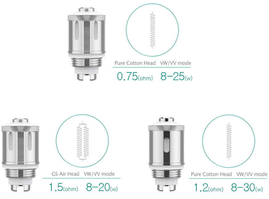Судя по надписи, называется он GS Air 2, и от предыдущего варианта GS Air отличается довольно сильно. Во-первых, он тоньше предшественника и имеет диаметр всего 14 мм, а во-вторых, снизу на нем появилось традиционное кольцо регулировки подачи воздуха. Больше никаких винтиков и отверток, все как у «взрослых» клиромайзеров. Что касается сменного испарителя, то это все тот же испаритель GS Air, но, присмотревшись к нему повнимательнее, мы видим, что он имеет сопротивление всего 0.75 Ом. Для чего понадобился испаритель с более низким сопротивлением, нам вскоре станет ясно.