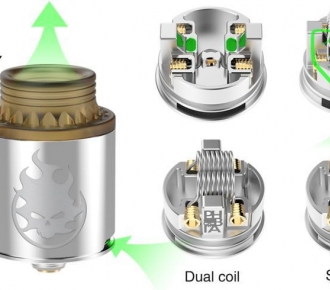 PHOBIA RDA представляет из себя дрипку на 24мм, которая возможна на данный момент в четырех расцветках: черной, золотой, стальной и радужной. Интересный факт: для каждого цвета база устройства будет иметь аналогичную окраску. В качестве дрип типа производителем был выбран популярный 810-ый формат, но дрипка поддерживает и установку чаф кэпов на 24мм. В комплекте с девайсом как раз будет находится таковой, а так же специально отведенная под это дело дополнительная боковая юбка.