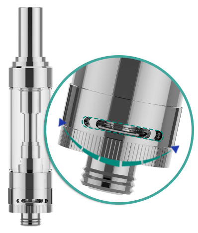 Судя по надписи, называется он GS Air 2, и от предыдущего варианта GS Air отличается довольно сильно. Во-первых, он тоньше предшественника и имеет диаметр всего 14 мм, а во-вторых, снизу на нем появилось традиционное кольцо регулировки подачи воздуха. Больше никаких винтиков и отверток, все как у «взрослых» клиромайзеров. Что касается сменного испарителя, то это все тот же испаритель GS Air, но, присмотревшись к нему повнимательнее, мы видим, что он имеет сопротивление всего 0.75 Ом. Для чего понадобился испаритель с более низким сопротивлением, нам вскоре станет ясно.