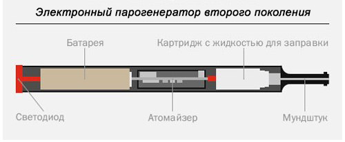 Второе поколение электронных парогенераторов всё меньше походит на традиционные сигареты. Увеличивается их размер, парогенератор «умнеет». Появляется USB порт для использования устройства во время зарядки, интегральные схемы дают возможность регулировки напряжения, включения и отключения аккумулятора, защиту от короткого замыкания, указывают заряд батареи и многое другое. Немаловажное значение у электронных парогенераторов второго поколения имеет появление обслуживаемого бака (клиромайзера), что позволило значительно снизить стоимость обслуживания за счёт многократного повторного использования элементов.