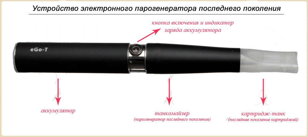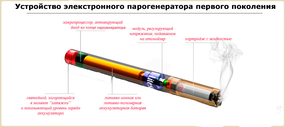 Парогенераторы первого поколения обычно имели внешний вид традиционных сигарет и использовались до разрядки аккумулятора или до полного выпаривания жидкости. Так же есть многоразовые парогенераторы первого поколения, которые могут заряжаться при помощи USB кабеля либо вставляются для зарядки в аккумулятор, имитирующий пачку для традиционных сигарет.